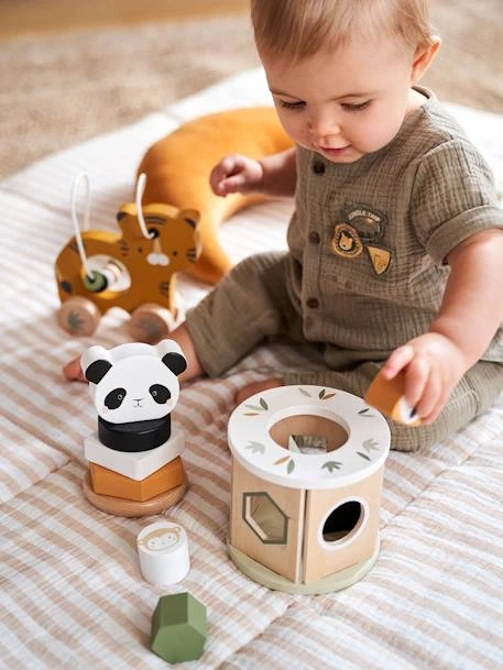- Coffret 3 jouets : un mini boulier tigre à roulettes, une boite des formes à encastrer, une pyramide à empiler panda