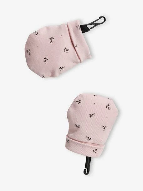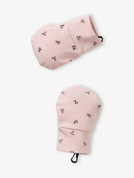 Ensemble bonnet + moufles + foulard + sac bébé fille en maille imprimée 95% coton, 5% élasthanne.