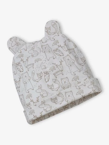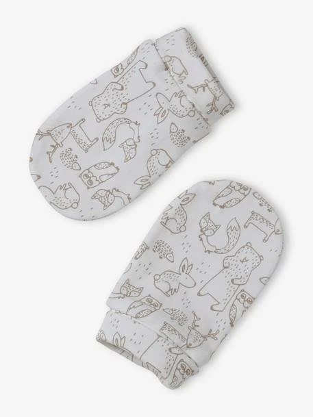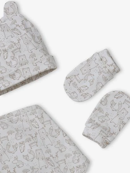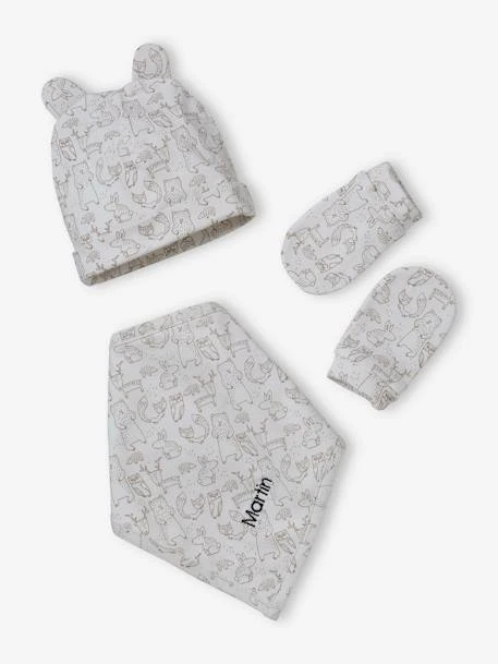 Ensemble bonnet + moufles + foulard + sac bébé en maille imprimée 95% coton, 5% élasthanne.