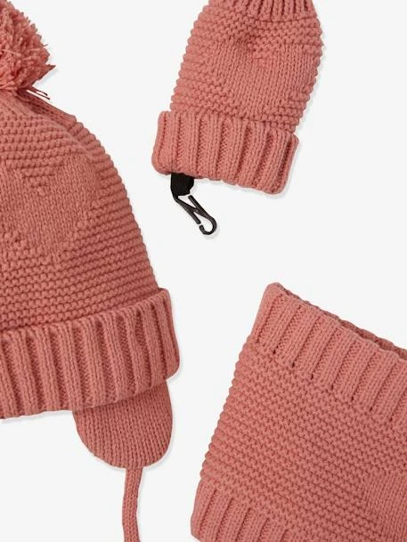 Ensemble bonnet + snood + moufles bébé fille en maille 60% coton, 40% acrylique, doublure en maille polaire 100% polyester.