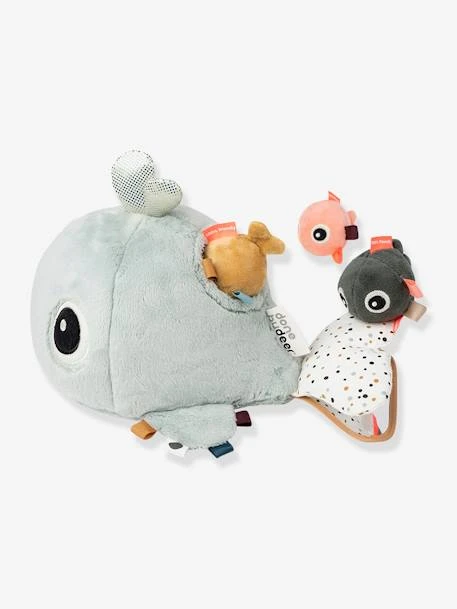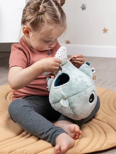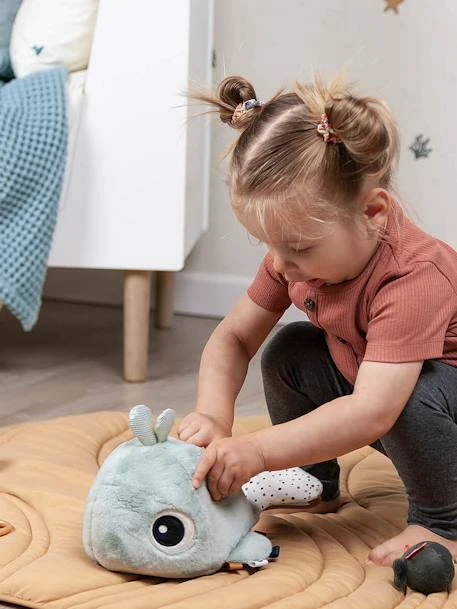 Craquez pour cette adorable baleine Wally, accompagnée de ses petits amis poissons ! La joyeuse baleine aime jouer à cache-cache. Découvrez comment les petits poissons se cachent à l’intérieur de Wally. Chaque poisson émet un son différent : une clochette, un bruit de papier et un carillon encourageront les petits à ramper derrière eux. Laissez votre petit bout découvrir les petits poissons, les différentes textures de la baleine ainsi que le miroir caché sur sa nageoire. Les étiquettes colorées et le jet d’eau seront également de belles surprises ! Ce jouet d’éveil va bien amuser les petits tout en développant leur concentration et leur coordination œil-main.