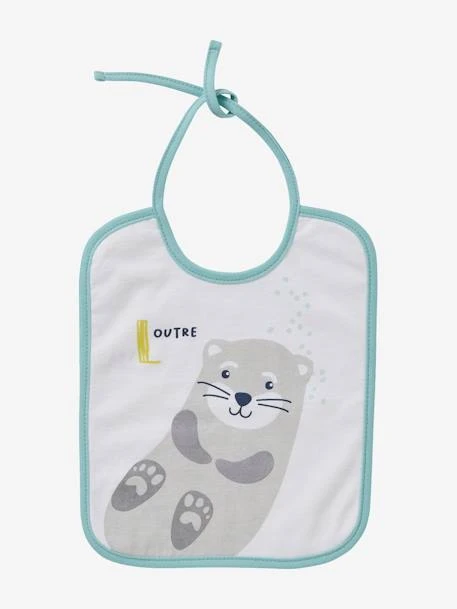 - Imprimé sur fond blanc, différent sur chaque bavoir : baleine, crabe, loutre, manchot, otarie, poulpe + un reprenant tous ces motifs