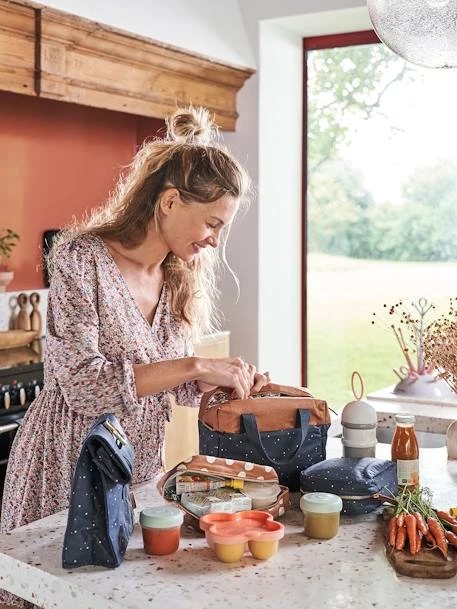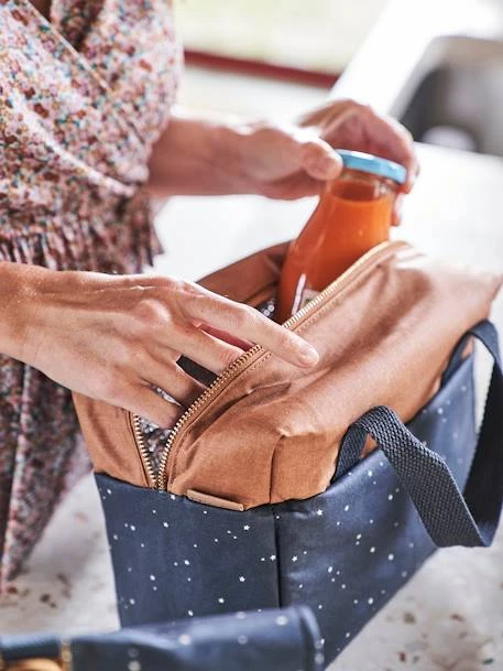 Idéale pour y placer les petits goûters, les repas chez la nounou ou les pique-nique, cette lunch box est en coton enduit imprimé, facile à nettoyer.