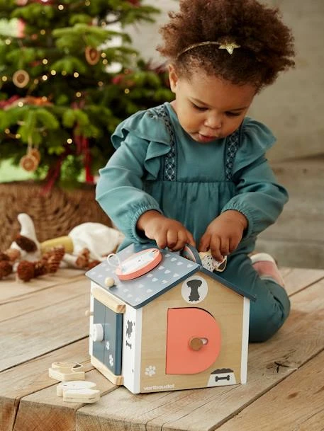 Une niche avec 6 ouvertures que l’enfant devra ouvrir pour ensuite y insérer un petit chien. Chaque ouverture propose un système différent : ouverture à pousser, à tirer, à boutonner, à clé… de quoi développer leur motricité fine en s’amusant !