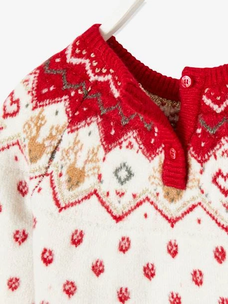 Pull jacquard de Noël bébé 69% acrylique, 27% polyester, 3% élasthanne, 1% fibre métallisée.