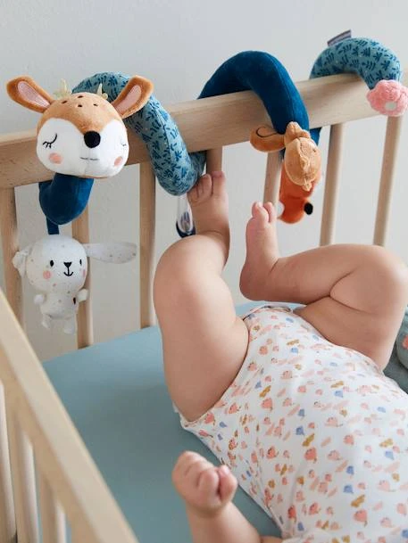 Enroulez cette belle spirale d’activités autour d’un lit, d’une poussette ou d’un cosy ! Elle amusera bébé avec ses petits jouets intrigants. Lapin et anneau, renard vibrant… C’est parti pour de joyeuses découvertes !