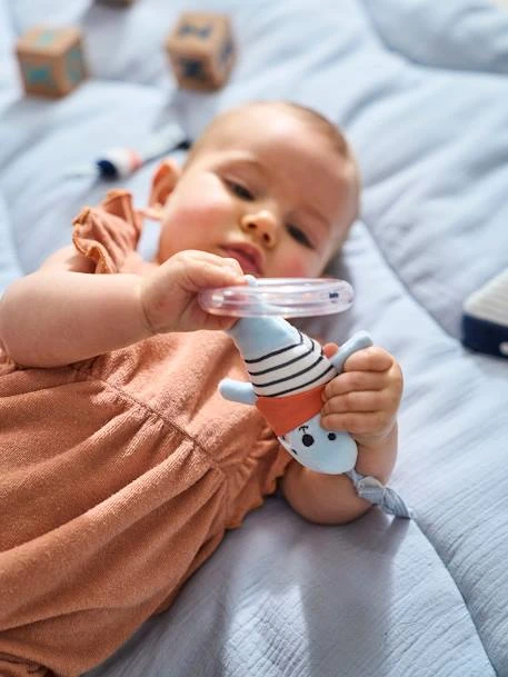 - Jouets attachés au tapis : phoque avec lien en velours et coton, poisson attaché avec lien sur tapis en velours et coton avec pouet pouet, mouette en velours et coton avec clochette, 3 anneaux plastiques de couleurs, 1 anneau transparent avec billes de couleurs, drapeaux et rubans en velours, miroir, bouchon attaché par lien en coton et velours