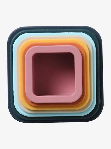 7 cubes en silicone à empiler pour former une pyramide ! Tendance et idéal pour les enfants, le silicone est doux, se mâchouille sans problème et peut aussi être utilisé dans le bain. Cette pyramide apprend également la notion de taille et de tri du plus petit au plus grand. Pour la ranger facilement sans encombrer, les cubes s’encastrent les uns dans les autres.