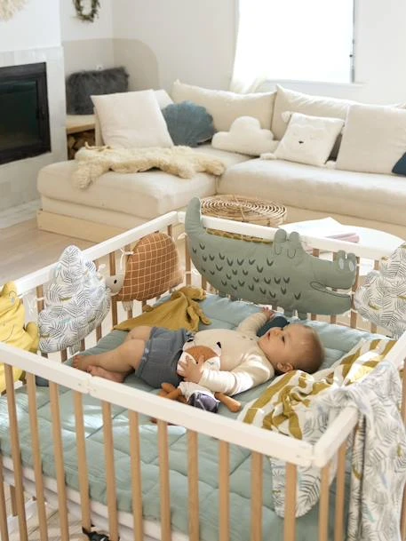 A la fois déco, confortable et anti choc, le tour de lit / tour de parc rassure les enfants en les entourant de douceur et en reproduisant le cocon de la maternité. Bébé pourra s’éveiller en toute sécurité, sans risquer de se cogner contre les barreaux. Les éléments modulables se fixent par nouettes et permettent une bonne circulation de l’air.