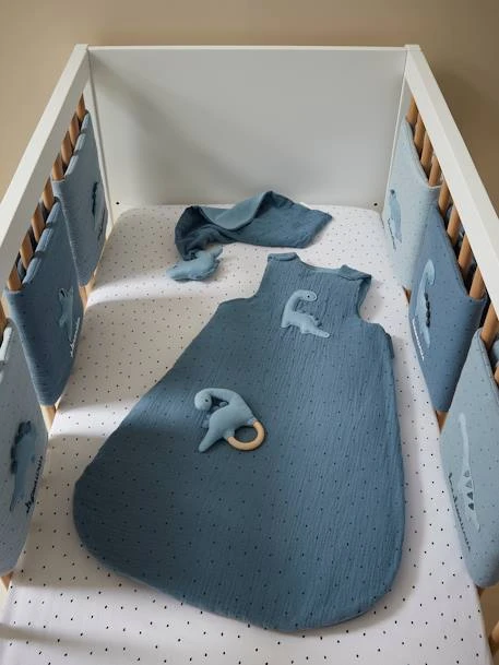 A la fois déco, confortable et anti choc, le tour de lit / tour de parc rassure les enfants en les entourant de douceur et en reproduisant le cocon de la maternité. Bébé pourra s’éveiller en toute sécurité, sans risquer de se cogner contre les barreaux. Les éléments modulables se fixent par scratches et permettent une bonne circulation de l’air. On craque pour la gaze de coton et les différents bleus qui décorent la pièce avec délicatesse.